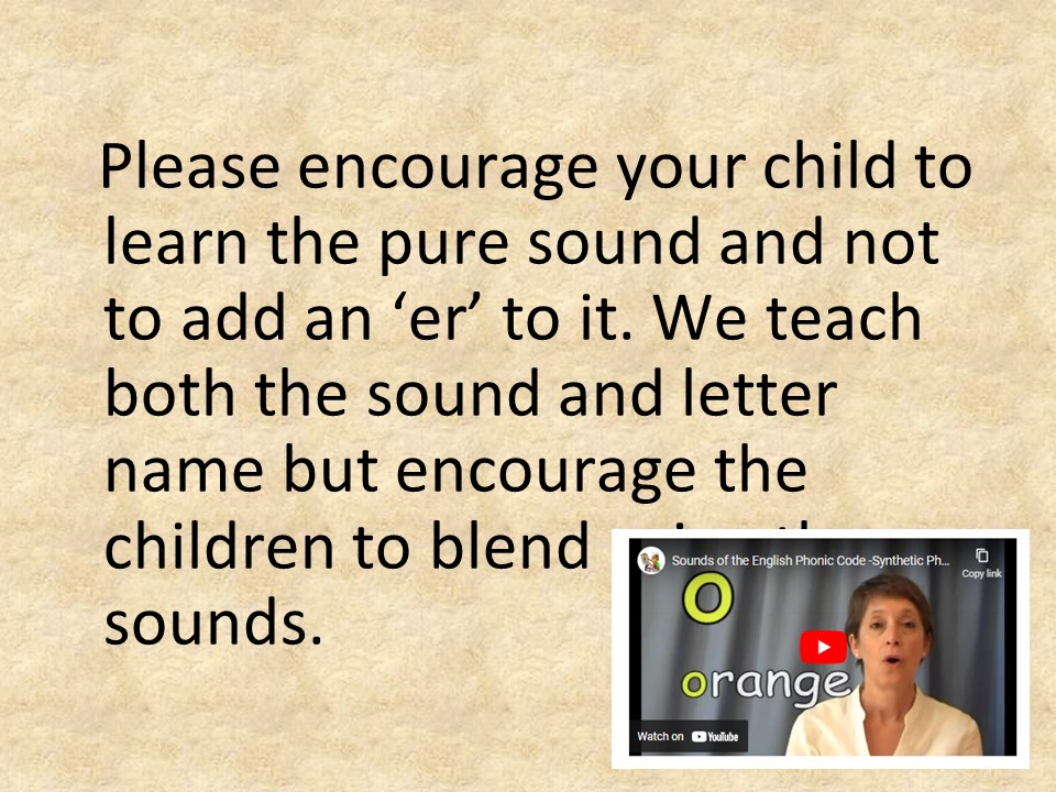 When learning to read the children are encouraged to pronounce letters in a slightly different way. This is called ‘precise pronunciation’ or ‘pure sounds’.