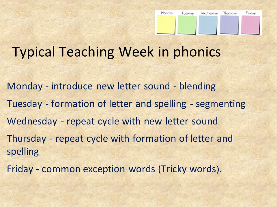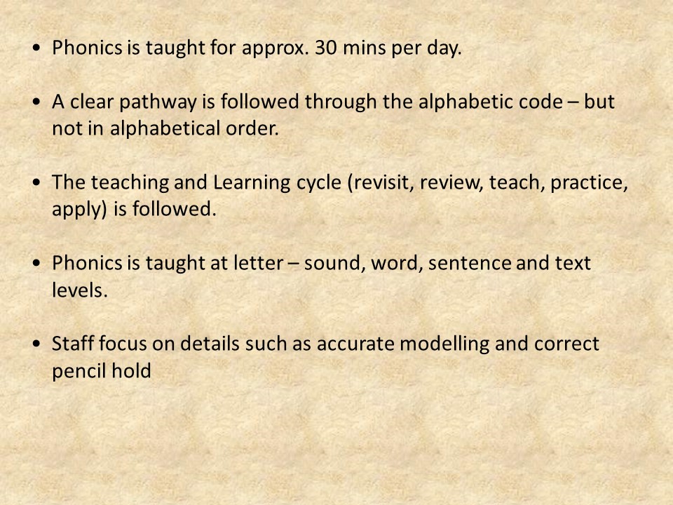 - Phonics is taught for a minimum of 30 minutes daily.