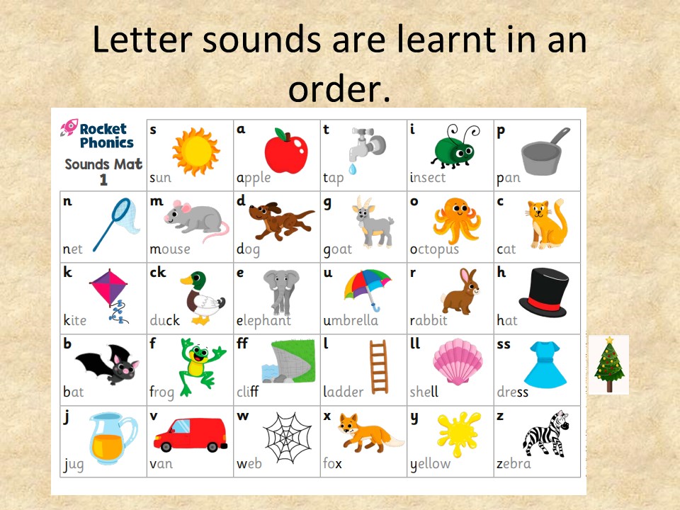 - Phonemes: Each letter in the alphabet has a ‘name’ (a = ay, b = bee, c = see, etc), but spoken English uses about 44 sounds (phonemes). These phonemes are represented by letters (graphemes). In other words, a sound can be represented by a letter (e.g. ‘s’ or ‘h’) or a group of letters (e.g. ‘th’ or ‘ear’).These sounds are taught in a particular order. The first sounds to be taught are s, a, t, p.